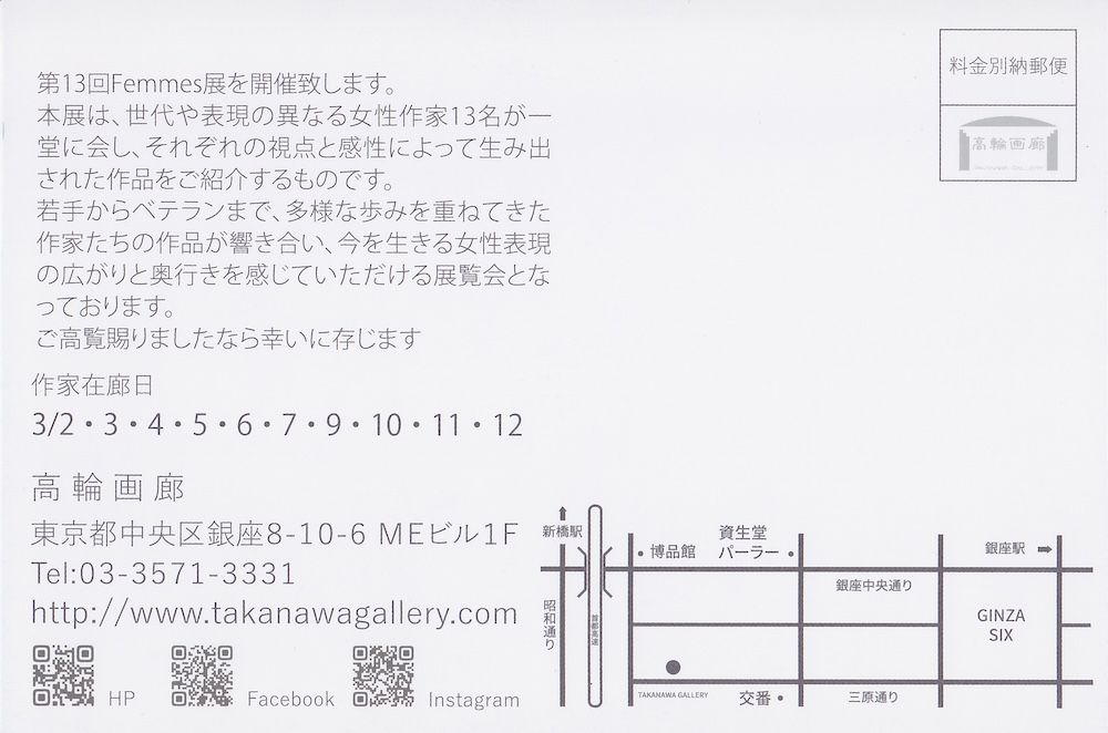 HOME GALLERY PROFILE NEWS CONTACT Blog 2026/03/01 第13回Femmes展 高輪画廊の「第13回Femmes展」に新作3点を出品致します。 お近くにお越しの際は、ご高覧くださいますようお願い申し上げます。 http://takanawagallery.com/ 第13回Femmes展 2026.3.2(月)-3.12(木) 8(日)休廊 11:00-19:00(土-18:00) 高輪画廊 〒104-0061 東京都中央区銀座8丁目10−6 銀座MEビル1F < Prev. < 新着記事一覧へ戻る New Article 2026/03/01 第13回Femmes展 2025/12/22 10th anniversary あなたのためのカレンダー展Ⅹ 2025/11/01 大山智子/張麗寧 2人展 〜かぜわたる〜 Archives 2026年3月 2025年12月 2025年11月